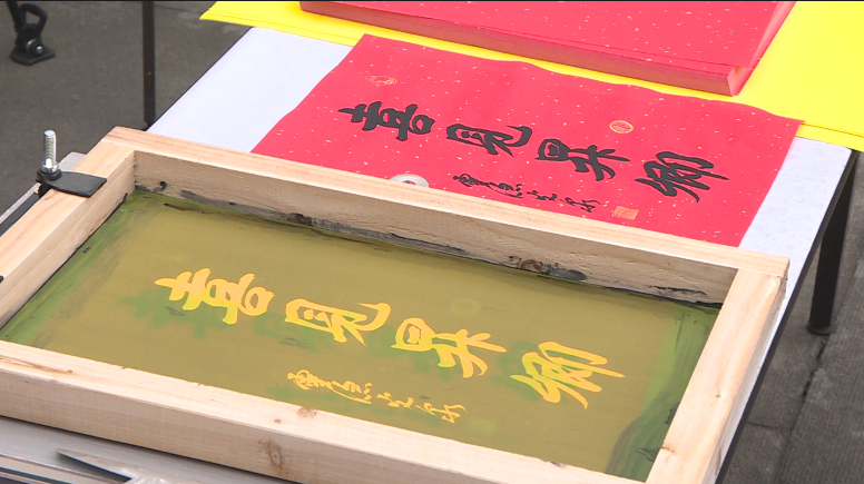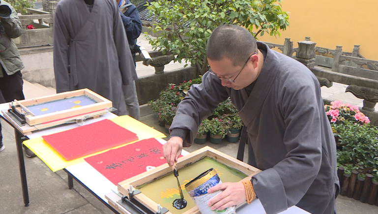 一幅祈福年历的完好工序有十八道,经过从选料、套色,到印刷、切模等等,简直全赖手艺完结。参加印发的法师介绍说,一般光泉法师写好字之后,就会制造印刷的模版,这个版面用的是绢布,固定到印刷版上,分两道工序刷上去,第一道墨汁印字,第二道刷金粉。除了右上角的属相图画和光泉法师法号外,本年还新增了乙巳年年号。